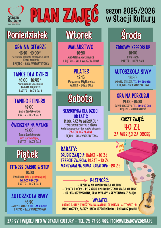 - Zapisy: w Stacji Kultury, tel. 75 71 36 483, mail: it@swieradowzdroj.pl