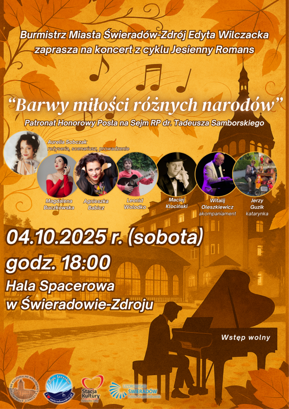 Burmistrz Miasta Świeradów-Zdrój Edyta Wilczacka zaprasza na wyjątkowy koncert pt. „Barwy miłości różnych narodów”, organizowany w ramach cyklu Jesienny Romans. Wydarzenie odbędzie się pod Patronatem Honorowym Posła na Sejm RP dr. Tadeusza Samborskiego.