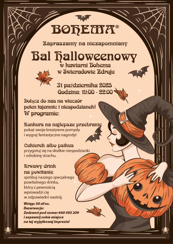 Zapraszamy na niezapomniany Bal Halloweenowy, który odbędzie się 31 października 2025 roku w kawiarni Bohema w Świeradowie-Zdroju.