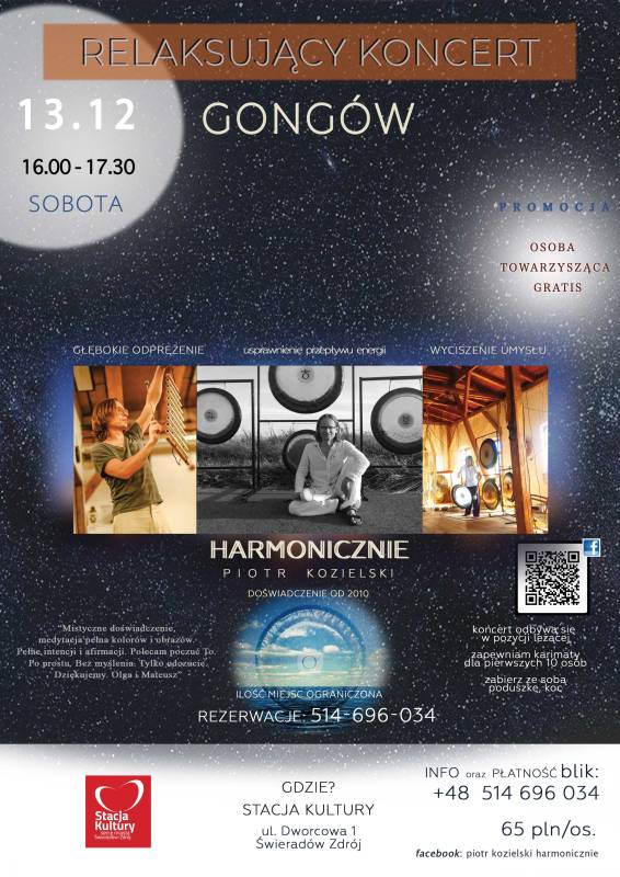 Zapraszamy na wyjątkowy koncert gongów w wykonaniu Piotra Kozielskiego – Harmonicznie, który od 2010 roku prowadzi dźwiękowe podróże w głąb siebie.