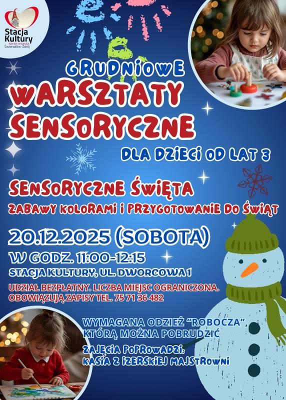 Tuż przed świętami Stacja Kultury ponownie zamieni się w kolorową, pachnącą i pełną wrażeń przestrzeń odkrywania świata! Już 20 grudnia najmłodsi mieszkańcy – dzieci od 3. roku życia – wezmą udział w wyjątkowych Warsztatach Sensorycznych „Sensoryczne Święta”, które poprowadzi Kasia z Izerskiej Majstrowni.