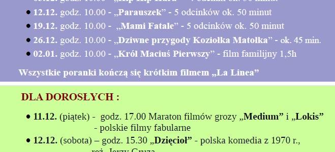 - 12.12 (sobota) – godz. 15.30 „Dzięcioł” - polska komedia z 1970r., reż. Jerzy Gruza
