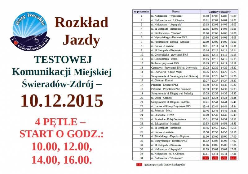 w dniu 10.12.2015 r. (czwartek), po raz drugi uruchomimy testową jazdę autobusu Komunikacji Miejskiej Świeradów-Zdrój.