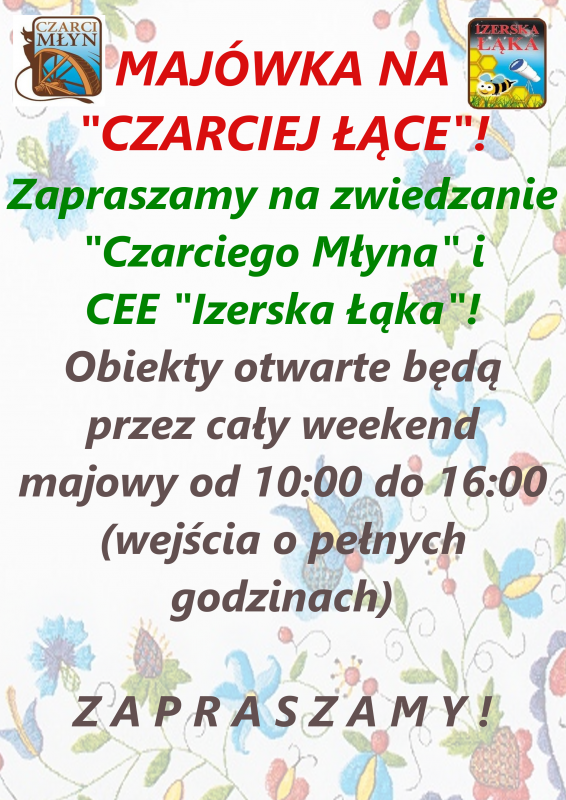 Informujemy, że obiekty dostępne będą dla zwiedzających przez całą majówkę. Zachęcamy do odwiedzin Centrum Edukacji Ekologicznej "Izerska Łąka" szczególnie w dniach 2 i 3 maja na seanse filmowe o godzinie 10:30. Więcej informacji: 75 617 14 42 lub izerskalaka@swieradowzdroj.pl. W "Czarcim Młynie" zaś czekają dawne wnętrza z oryginalnymi maszynami i repliką koła młyńskiego oraz zabytkowa piekarnia i Sala Biesiadna, zapraszamy!