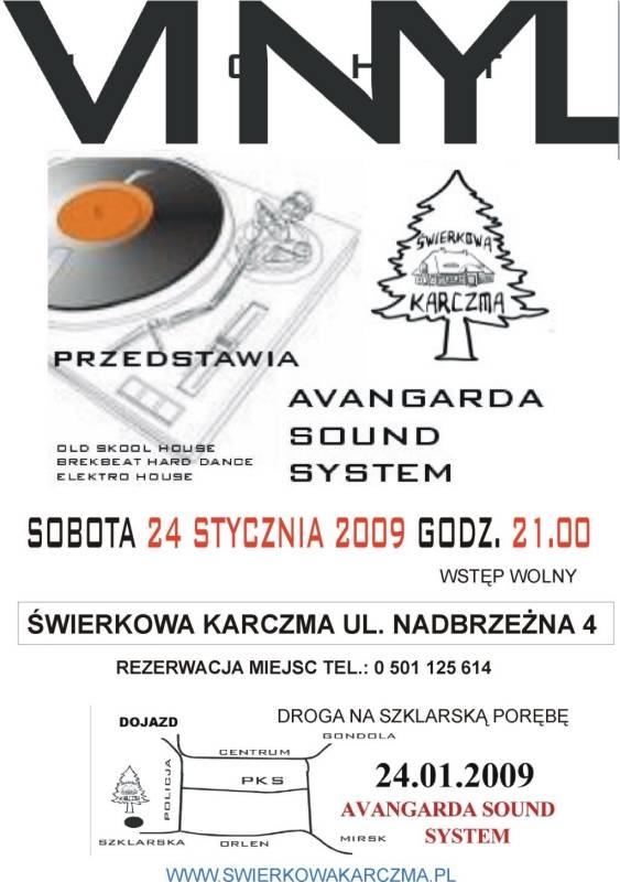Zapraszamy Państwa do Świerkowej Karczmy (ul. Nadbrzeżna 4) na imprezę pn. AVANGARDA SOUND SYSTEM, która odbędzie się w sobotę 24 stycznia br. o godz. 21.00. Wstęp wolny