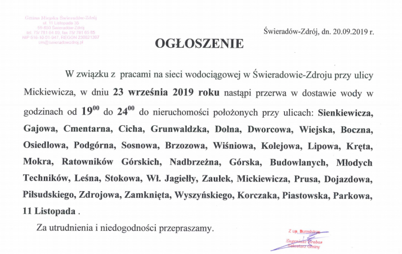 W związku z pracami na sieci wodociągowej w Świeradowie-Zdroju przy ulicy Mickiewicza, w dniu 23 września 2019 roku nastąpi przerwa w dostawie wody w godzinach od 19 00 do 24 00 do nieruchomości położonych przy ulicach: Sienkiewicza, Gajowa, Cmentarna, Cicha, Grunwaldzka, Dolna, Dworcowa, Wiejska, Boczna, Osiedlowa, Podgórna, Sosnowa, Brzozowa, Wiśniowa, Kolejowa, Lipowa, Kręta, Mokra, Ratowników Górskich, Nadbrzeżna, Górska, Budowlanych, Młodych Techników, Leśna, Stokowa, Wł. Jagiełły, Zaułek, Mickiewicza, Prusa, Dojazdowa, Piłsudskiego, Zdrojowa, Zamknięta, Wyszyńskiego, Korczaka, Piastowska, Parkowa, 11 Listopada .