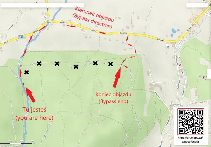 Interaktywna mapa z objazdem dostępna pod linkiem https://en.mapy.cz/s/gecofunefa