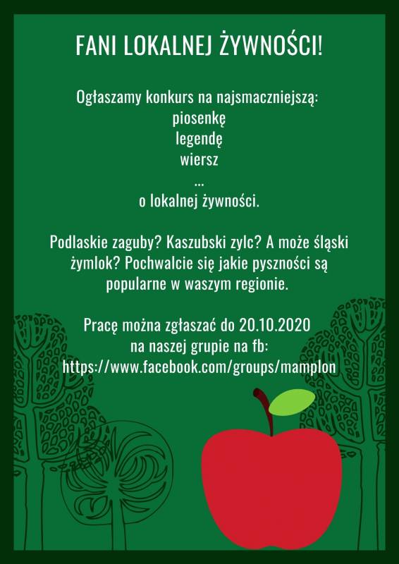 Piszesz? Śpiewasz? Lubisz lokalną żywność? Strona Mam Plon (https://mamplon.pl) organizuje konkurs na najsmaczniejszy utwór muzyczny lub literacki. Zaśpiewaj lub opisz popularne w twoim regionie danie, potrawę, przysmak i wygraj 500 zł! Ideą przedsięwzięcia jest promowanie tradycyjnych polskich smaków, a także regionalnych producentów żywności oraz wytwarzanych przez nich produktów. Wielki finał odbędzie się 24.10.2020 w stolicy humoru, czyli Wąchocku! Zapraszamy do wzięcia udziału.