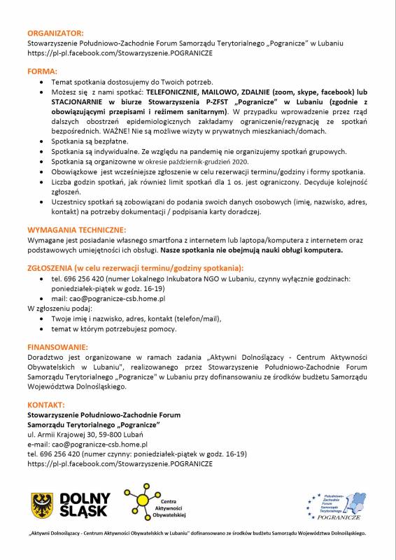 Doradztwo jest organizowane w ramach zadania „Aktywni Dolnoślązacy - Centrum Aktywności Obywatelskich w Lubaniu", realizowanego przez Stowarzyszenie Południowo-Zachodnie Forum Samorządu Terytorialnego „Pogranicze" w Lubaniu przy dofinansowaniu ze środków budżetu Samorządu Województwa Dolnośląskiego.