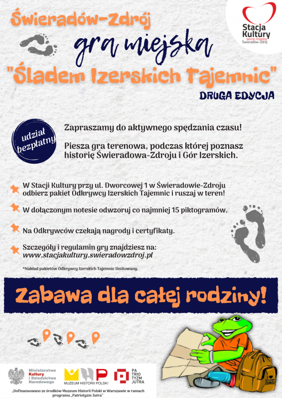 „Co tam w mieście gra? Druga edycja gry miejskiej Śladem Izerskich Tajemnic” - 89,5 pkt. na 100 możliwych, kwota dofinansowania 14 tys. zł;