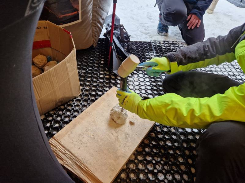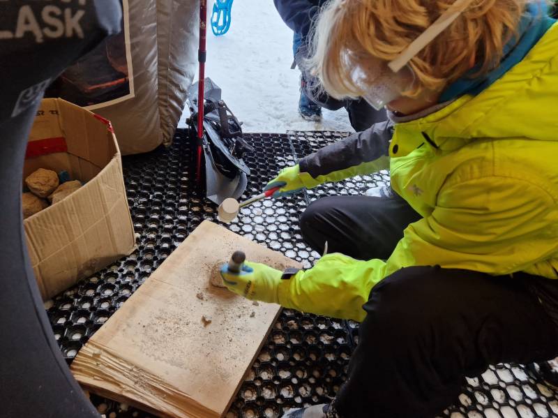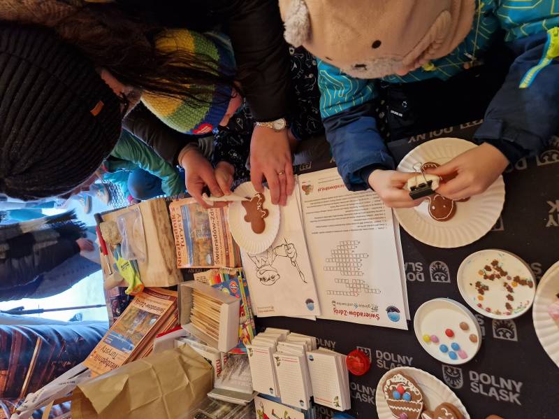 Warsztaty geologiczne poprowadzone przez Ewelinę Puzyniak z Kopalni Św. Jana w Krobicy również cieszyły się powodzeniem, a stukanie młotkiem w bryłę, by wydobyć z niej minerał, było dla niektórych istnym „aktem oczyszczenia” ze złych emocji. Pani Ewelina pokazywała także rakiety śnieżne i śmiałkowie pod jej okiem mogli spróbować poruszania się w nich po śniegu. Specjalnie przygotowana na tą okazję krzyżówka okazała się dla rozwiązujących niełatwa, bo wymagała znajomości całych Gór Izerskich, ale największym problemem okazała się nazwa żabki – symbolu Świeradowa, która dzięki uprzejmości Sky Walk brała aktywny udział w wydarzeniu. Na szczęście małe podpowiedzi nakierowywały na poprawną odpowiedź, ale powstały też nowe określenia żabki - KWISEK i KWISKA. Trud włożony w rozwiązanie krzyżówki przynosił wymierne korzyści, ponieważ dla odważnych podejmujących wyzwanie jej rozwiązania czekały gadżety, vouchery czy bilety wstępu przekazane przez: Ski & Sun Kolej Gondolowa i Apartamenty, Wieżę Sky Walk, Pracownie Piernikową Isabell, Czarci Młyn Czerniawa-Świeradów-Zdrój, Kopalnia Św. Jana w Krobicy. Bardzo dziękujęmy wszystkim, którzy odpowiedzieli na zaproszenie do współpracy i zaangażowali się w tegoroczny Projekt Zima, by po sąsiedzku promować Świeradów-Zdrój i walory Gór Izerskich.
