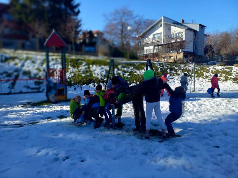 Pierwszy dzień rozpoczę to od spotkania z policjantem. P osterunkowy Rafał Tugi wyjaśnił zasady bezpiecznego poruszania się m.in. na stoku narciarskim i po zamarzniętych zbiornikach. Następnie Pani Radna Irena Chmielowska wraz z owczarkiem belgijskim malinois o wdzięcznym imieniu Hunter, poprowadziła zajęcia edukacyjne pod hasłem „Zwierzęta to nie zabawki!”. Nie brakowało także aktywności fizycznej i tak udało się skorzystać z resztek białego puchu.