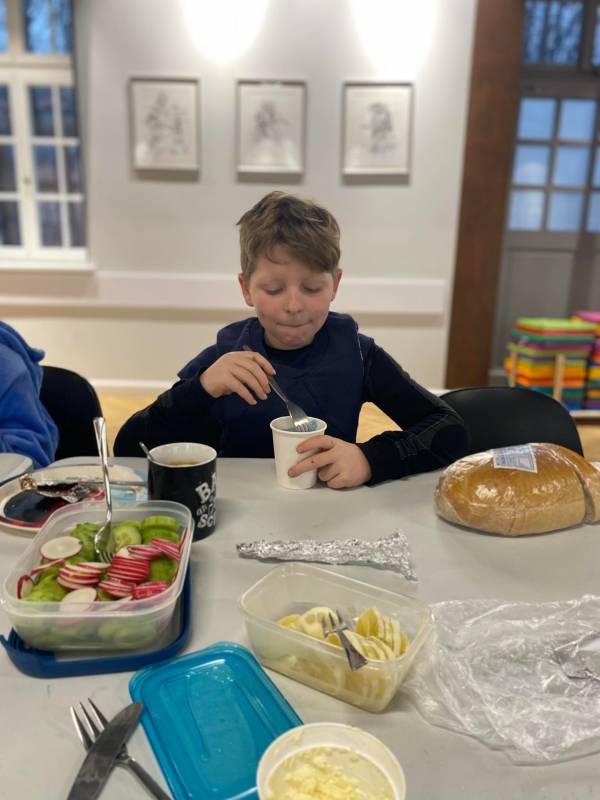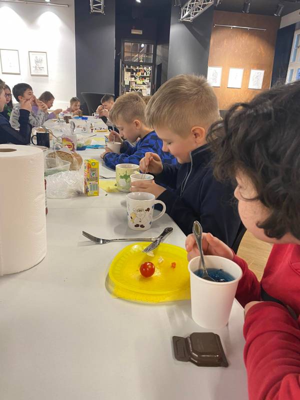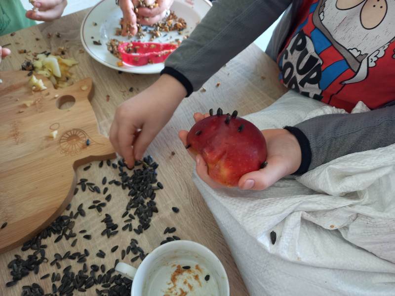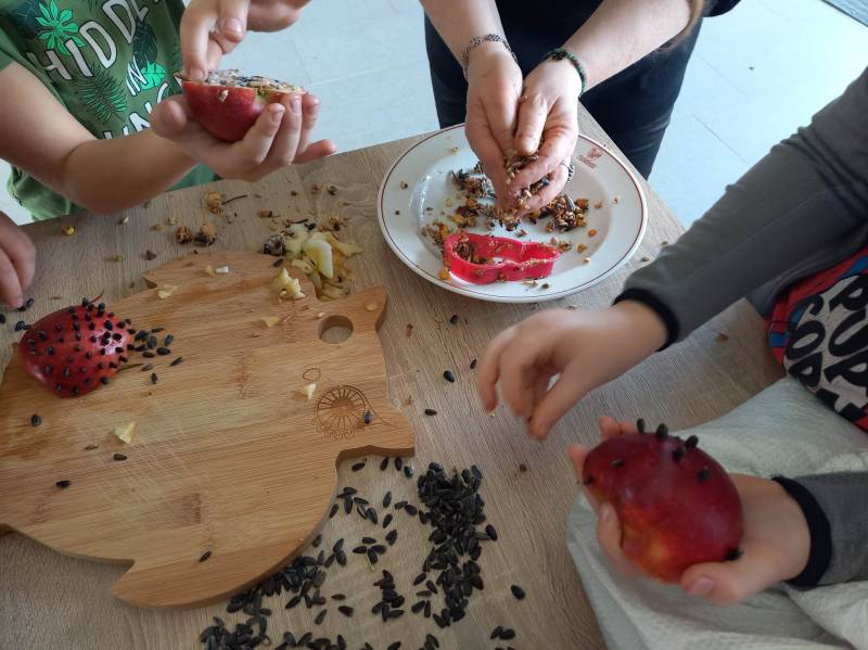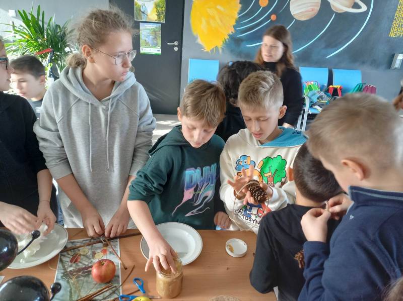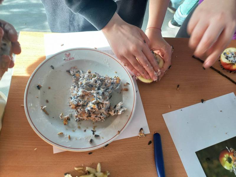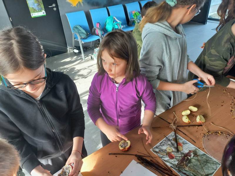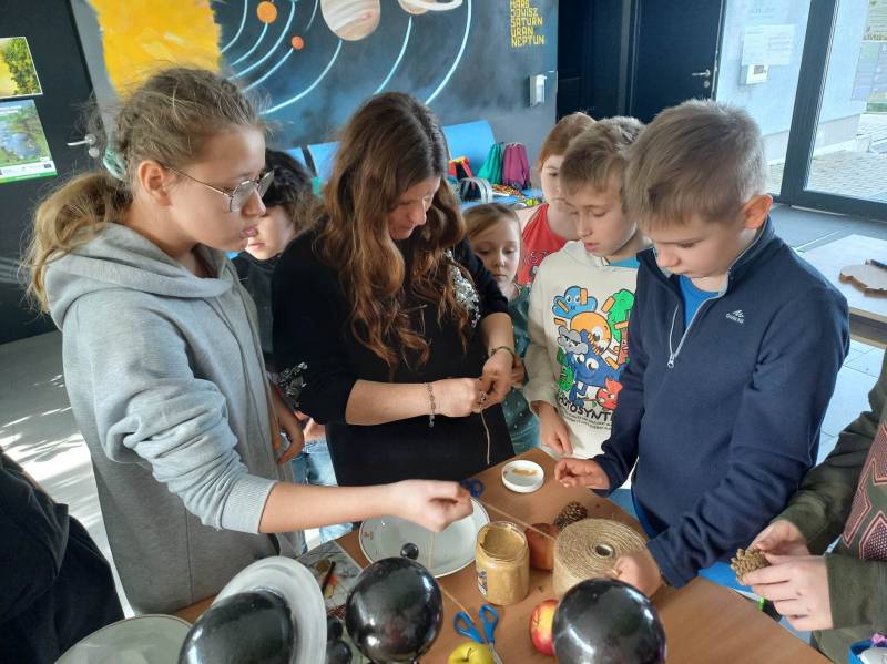 Drugi dzień, prócz porannego, słodkiego poczęstunku – wszak był to Tłusty Czwartek - uczestnicy spędzili na zajęcia ch edukacyjn ych w CEE NATURA 2000 „ Izerska Łąka” . Pani Kasi a Rzeczkowsk a przybliż yła dzieciom ptasi świat, przekaza ła szereg informacji o tym, jak prawidłowo dokarmiać ptaki oraz pokazała jak przygotować smakołyk i dla skrzydlatych przyjaciół.