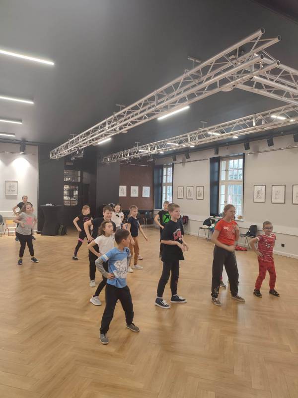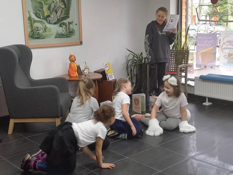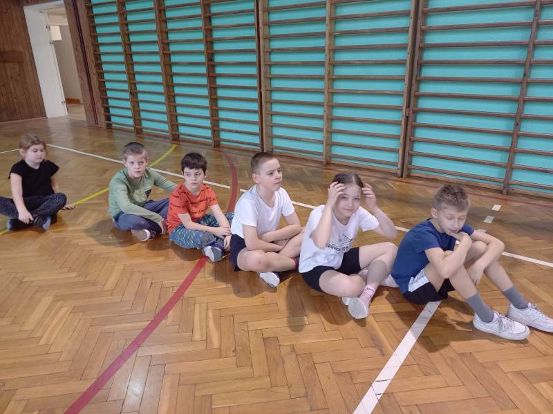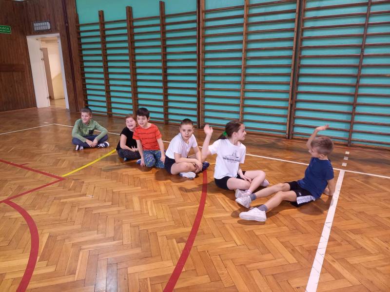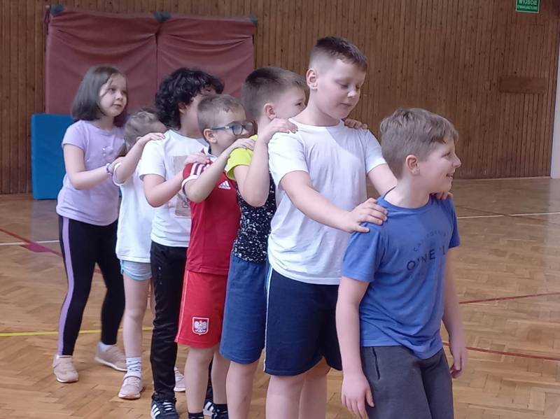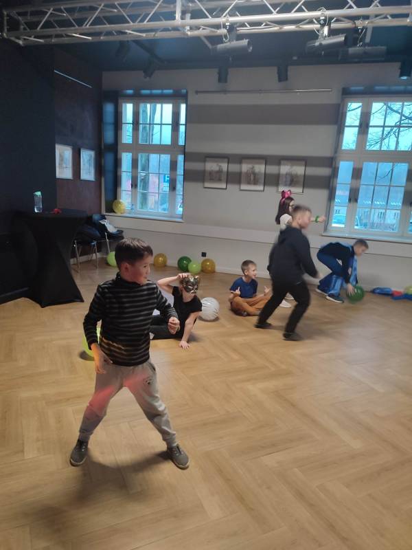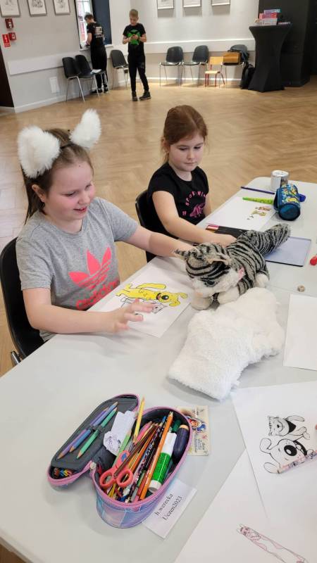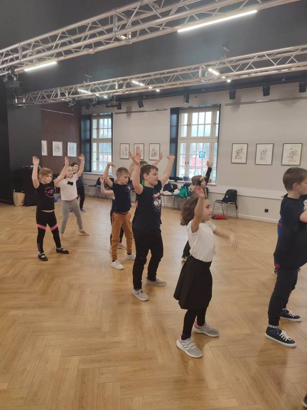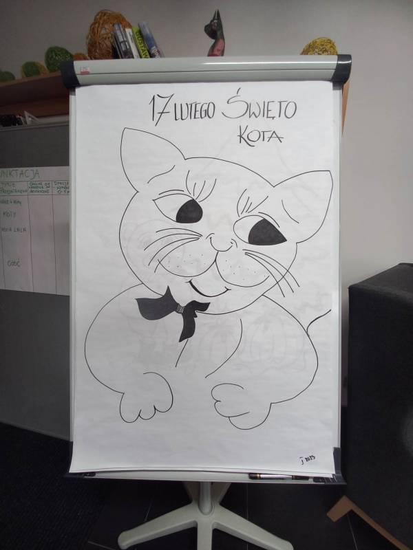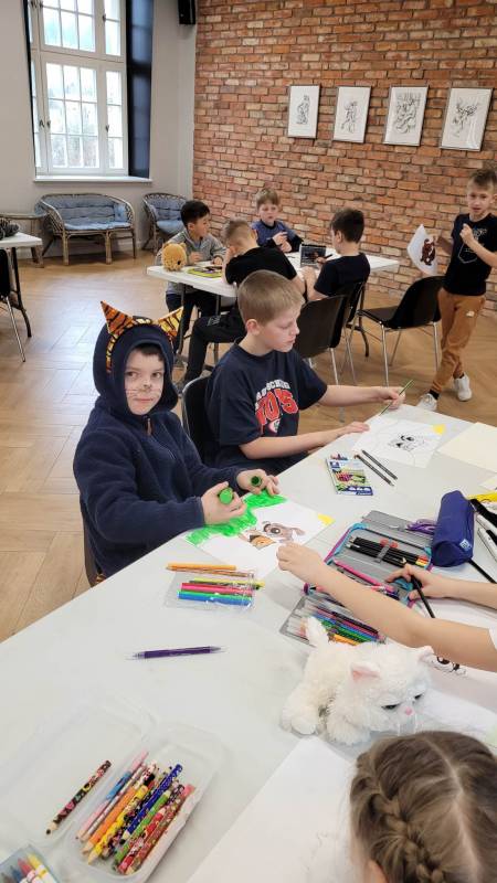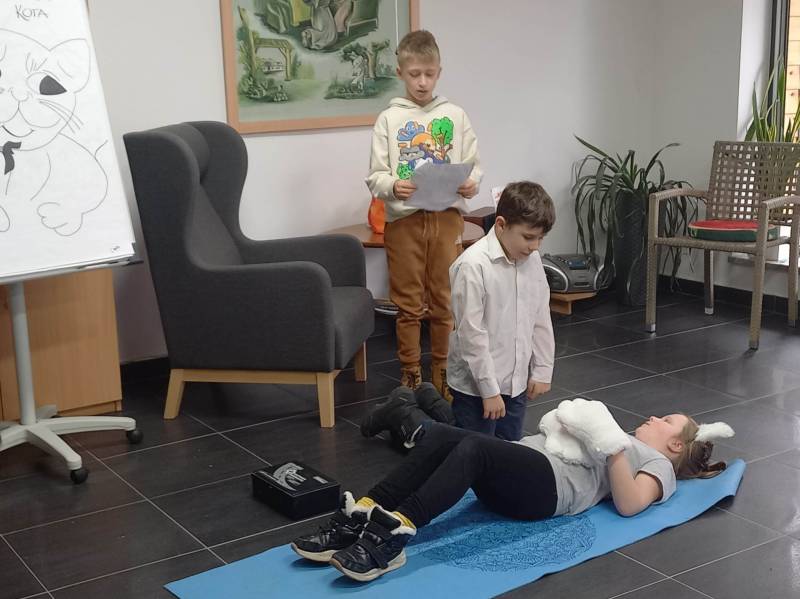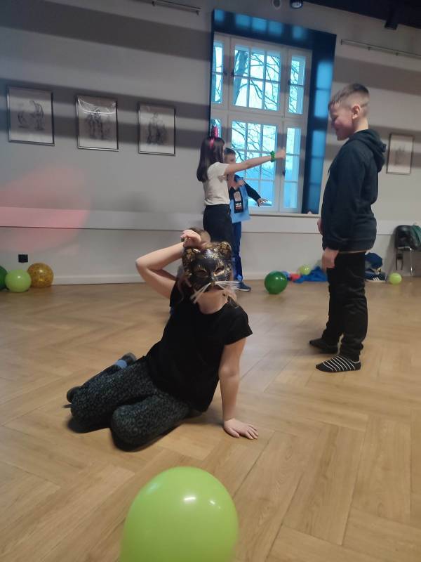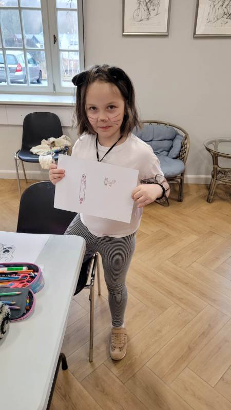 Trzeciego dnia zajęć obchodz ono Światowy Dzień Kota! Z tej okazji dzieci wykona ły prace plastyczne na konkurs w MBP „Izerka” oraz wystawiły przedstaw ienie z kotami w rolach głównych. Na zakończenie ostry wycisk zafundował im Pan Tomek Gajewski, z którym tańczyli i ćwiczyli.