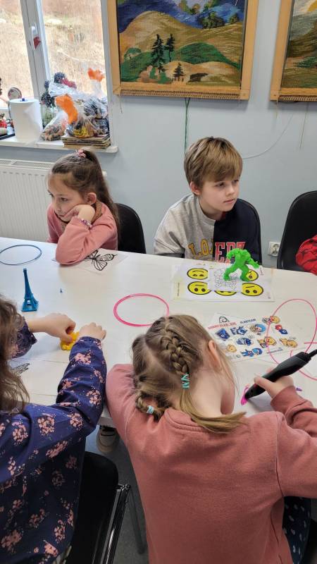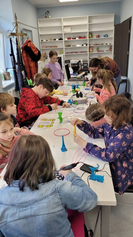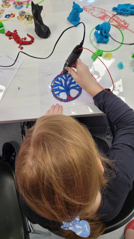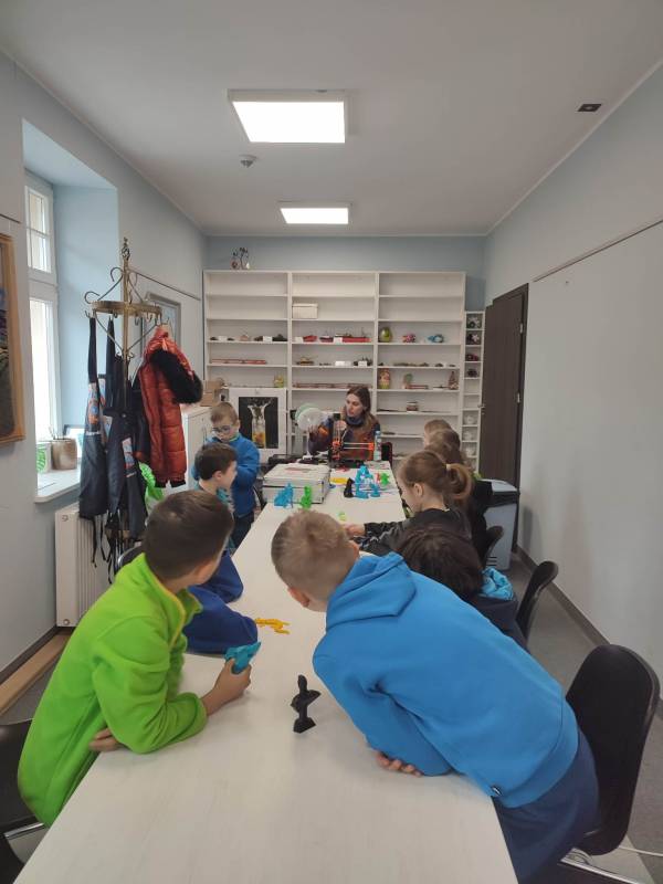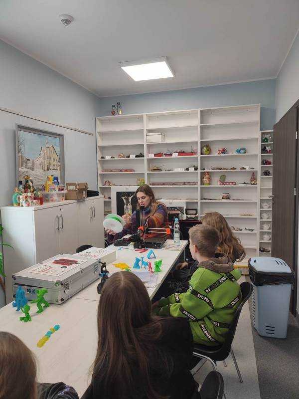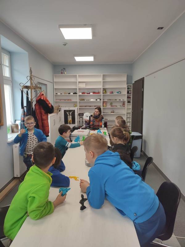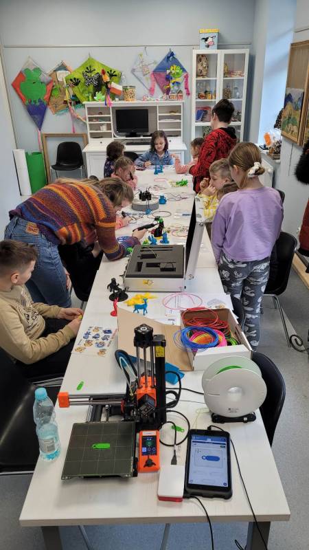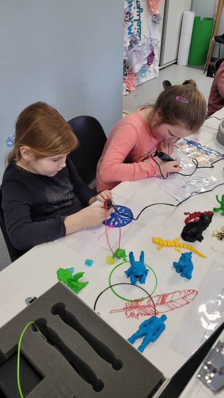 Drugi tydzień ferii uczestnicy rozpoczęli pełną przygód wędrówk ą po lesie z Leśnikiem Zygmuntem Czajką. Dowidziel i się dużo o przyrodzie oraz o dokarmianiu zwierząt zimą. Tego dnia naszą Stację Kultury o dwiedzili edukatorzy z Mobilnych Laboratoriów Przyszłości, którzy pokazali najmłodszym , jak działa wirtualna rzeczywistość. Najbardziej jednak uczestnikom zajęć spodobały się warsztaty z druku 3D. Za pomocą pistoletów wydrukowali trójwymiarowe ozdoby.