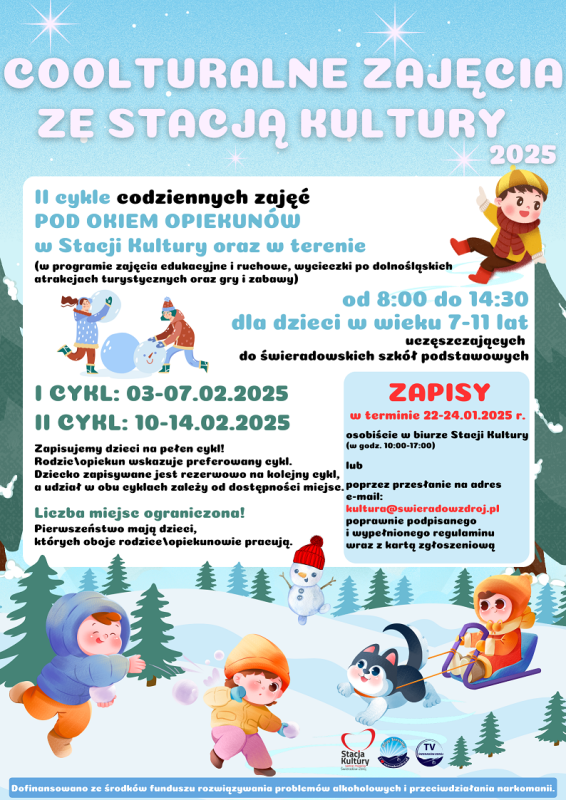 Zapraszamy dzieci w wieku 7-11 lat uczęszczające do świeradowskich szkół podstawowych na II cykle codziennych zajęć pod opieką wychowawców.
