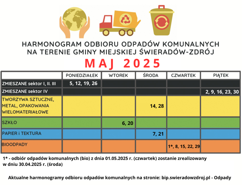 informujemy, że w związku ze świętem przypadającym na dzień 01.05, odbiór odpadów bio zaplanowany na dzień 01.05.2025 r. (czwartek), zostanie zrealizowany dzień wcześniej, tj. 30.04.2025 r. (środa).