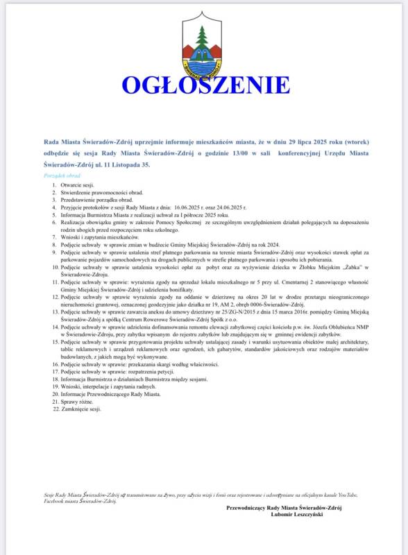 jutrzejsza (29.07.2025 r.) Sesja Rady Miasta Świeradów-Zdrój odbędzie się w MCKAiPG "Stacja Kultury" w Świeradowie-Zdroju przy ul. Dworcowej 1, godz. 13:00.