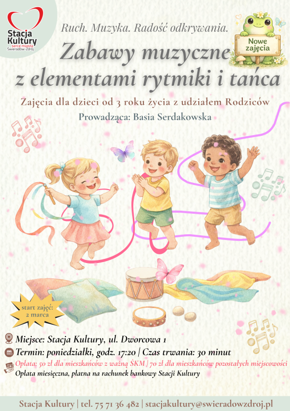 Stacja Kultury w Świeradowie-Zdroju rozszerza swoją ofertę edukacyjno-artystyczną o nowe zajęcia skierowane do najmłodszych dzieci od 3. roku życia. Już od marca ruszają zabawy muzyczne z elementami rytmiki i tańca, stworzone specjalnie z myślą o pierwszych doświadczeniach muzycznych dzieci oraz wspólnym, aktywnym czasie z rodzicami.