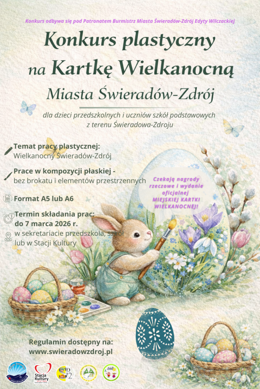 Zapraszamy dzieci przedszkolne oraz uczniów szkół podstawowych z terenu Świeradowa-Zdroju do udziału w konkursie plastycznym na projekt oficjalnej Kartki Wielkanocnej Miasta Świeradów-Zdrój.