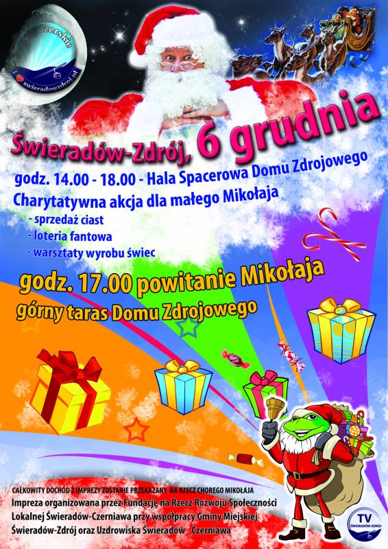 ZAPRASZAMY WSZYSTKICH DO HALI SPACEROWEJ DOMU ZDROJOWEGO W ŚWIERADOWIE-ZDROJU NA IMPREZĘ POŁĄCZONĄ ZE ZBIÓRKĄ ŚRODKÓW DLA MAŁEGO MIKOŁAJA.