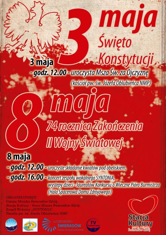 zapraszamy do udziału w uroczystościach z okazji 3 i 8 maja i pamiętajmy, że 2 maja jest dzień flagi wywieśmy je na naszych domach, oknach żeby w tym dniu nasze miasto było biało-czerwone. Natomiast 1 maja jest rocznica wstąpienia Polski do Unii Europejskiej także nie zapominajmy o tym. Wszystkim Państwu życzymy pięknego, długiego, majowego świętowania.