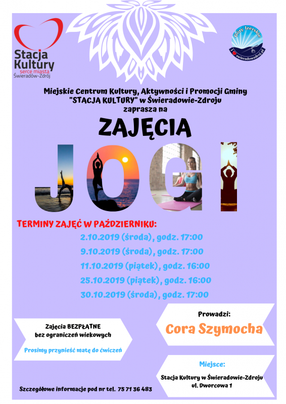 Wszystkich mieszkańców Świeradowa-Zdroju zainteresowanych zajęciami JOGI w Stacji Kultury informujemy, że w październiku zajęcia odbędą się w następujących terminach: