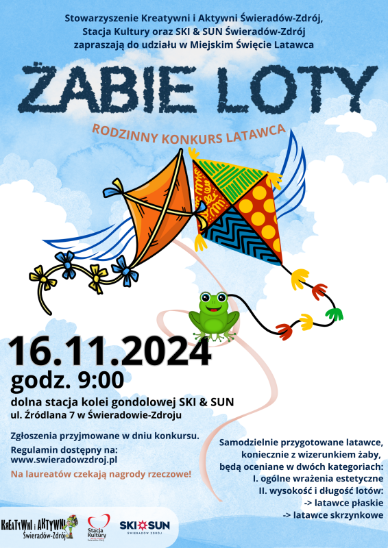 W sobotę 16 listopada 2024 r. zapraszamy na miejskie święto latawca Żabie Loty, które odbędzie się przy dolnej stacji kolei gondolowej Ski&Sun przy ul. Źródlanej 7. Latawce przygotowane zarówno przez młodych, jak i tych ciut starszych modelarzy wezmą udział w rodzinnym konkursie latawca. Zawody rozpoczną się o godz. 9:00.