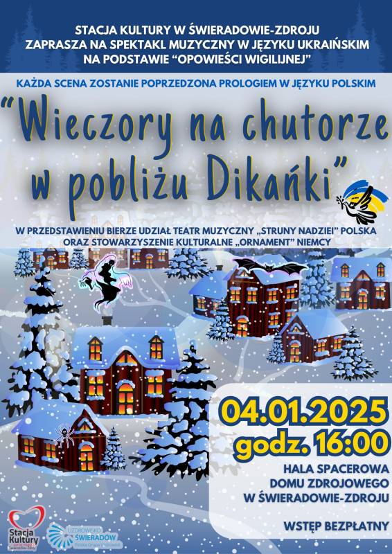 Koncert odbędzie się na scenie malowniczej Hali Spacerowej w uzdrowisku Świeradów-Zdrój, w atmosferze pełnej magii i świątecznego nastroju. Będzie to niezapomniana okazja, by spędzić czas w towarzystwie muzyki, śpiewu i tańca, a także przenieść się do klimatycznego świata ukraińskiej tradycji.