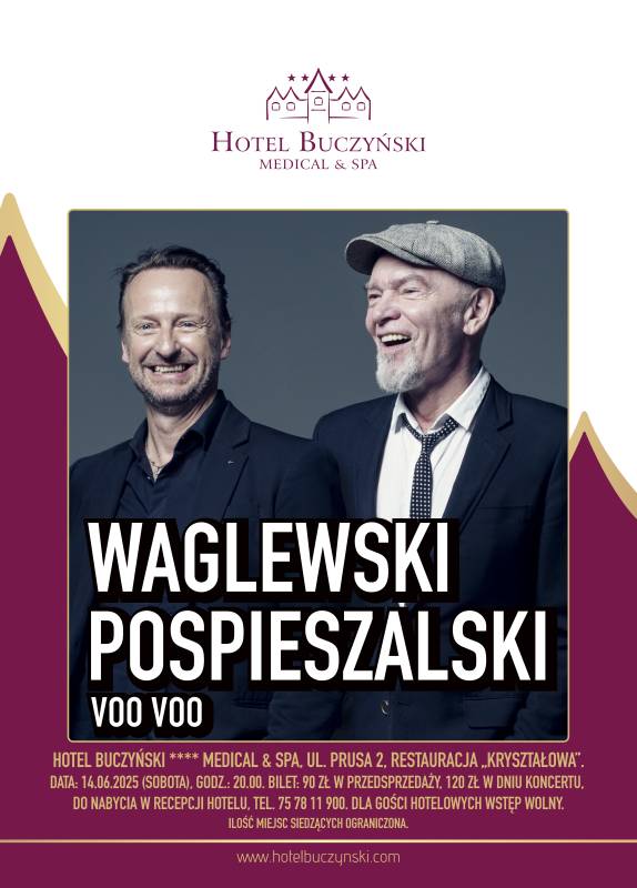 Już 14 czerwca 2025 r. (sobota) o godzinie 20:00 zapraszamy na niezapomniany wieczór muzyczny z udziałem dwóch wybitnych artystów polskiej sceny muzycznej – Wojciecha Waglewskiego i Mateusza Pospieszalskiego!