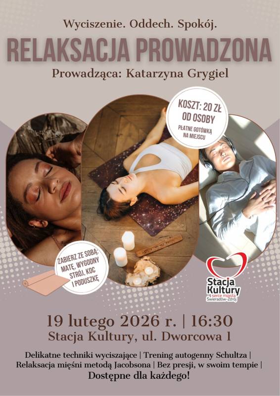 Zapraszamy na kolejne spotkanie z cyklu Relaksacja prowadzona, które odbędzie się 19 lutego 2026 r. o godz. 16:30 w siedzibie Stacji Kultury przy ul. Dworcowej 1 w Świeradowie-Zdroju.