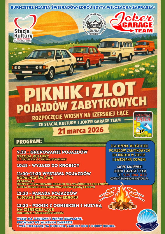 Zaprasza mieszkańców oraz gości na Piknik i Zlot Pojazdów Zabytkowych, który odbędzie się 21 marca 2026 roku. Wydarzenie organizowane jest wspólnie przez Stację Kultury oraz Joker Garage Team i będzie wyjątkową okazją do symbolicznego powitania wiosny w motoryzacyjnym klimacie.
