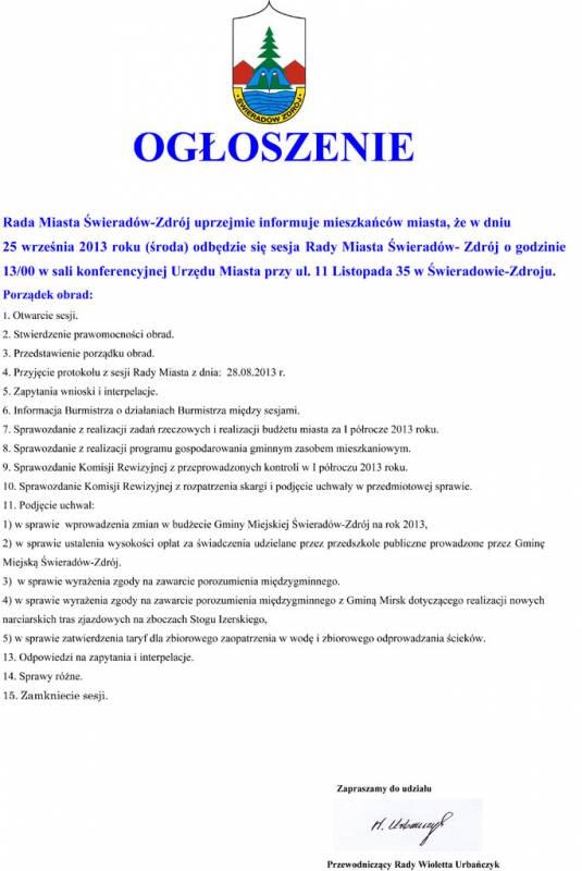 Rada Miasta Świeradów-Zdrój uprzejmie informuje mieszkańców miasta, że w dniu 25 września 2013 roku (środa) odbędzie się sesja Rady Miasta Świeradów- Zdrój o godzinie 13/00 w sali konferencyjnej Urzędu Miasta przy ul. 11 Listopada 35 w Świeradowie-Zdroju.