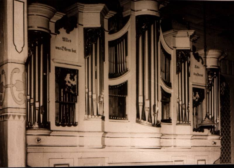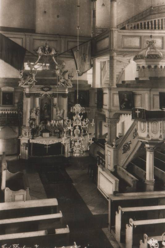 The church was built with great panache in the baroque style. From the main gate it ran by way of a great nave with a finely decorated pulpit to an altar holding an image of the blessing Christ. Suspended from the beautifully executed vaulting were three huge chandeliers. On the first floor was a gallery surrounding the interior of the church, which provided seating for men. Women took their places downstairs. Hanging on the front wall of the gallery, in the vicinity of the altar, were images of the pastors. On the second floor rose an immense organ, and in each of the four corners of the church were smaller galleries. Children sang there during Holy Mass, divided into four choirs. In addition to the main entrance, three other entrances led into the church.