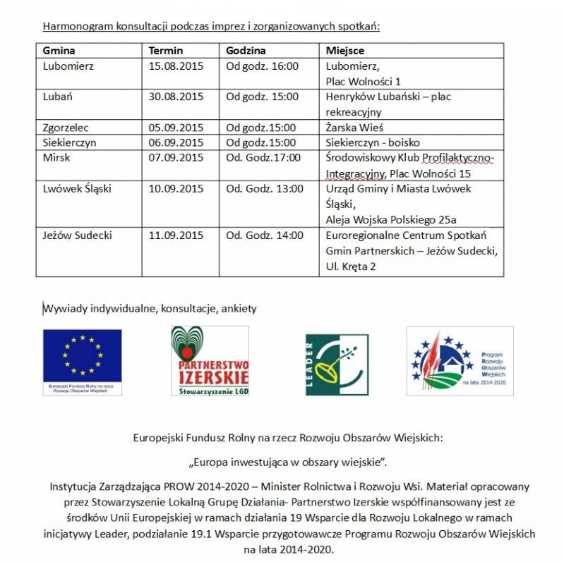 W związku z rozpoczęciem nowego okresu programowania 2014 – 2020 oraz możliwością uzyskania pomocy finansowej ze środków unijnych w ramach inicjatywy LEADER, RLKS (rozwój lokalny kierowany przez społeczność lokalną), niezbędne jest przeprowadzenie konsultacji społecznych. Stowarzyszenie LGD Partnerstwo Izerskie zaprasza do udziału w spotkaniach informacyjnych, na których zostaną zaprezentowane założenia i rodzaje działań w nowej Lokalnej Strategii Rozwoju, zostanie przygotowana analiza obszaru pod kątem zasobów, możliwości, szans, zagrożeń oraz priorytetów wsparcia.