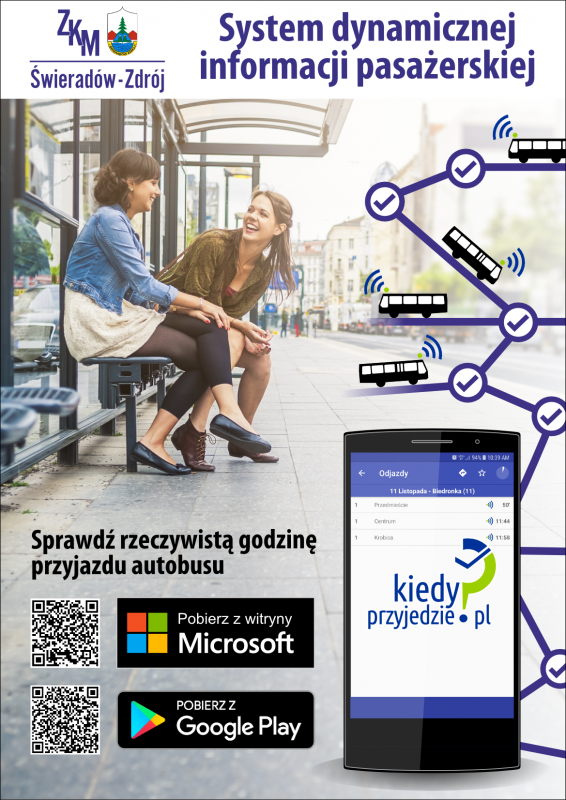 Z przyjemnością informujemy o wdrożeniu w Świeradowie-Zdroju systemu dynamicznej informacji pasażerskiej działającego w oparciu o serwis internetowy kiedyPrzyjedzie.pl. Dzięki niemu nasi pasażerowie uzyskali dostęp do rzeczywistych odjazdów autobusów z dowolnego przystanku w naszej sieci komunikacyjnej.