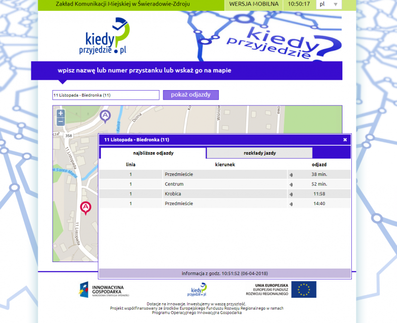 - korzystając z mobilnej wersji strony, z uproszczonym interfejsem, ułatwiającej dostęp do serwisu przy pomocy telefonów komórkowych oraz innych urządzeń przenośnych (wersja mobilna uruchamia się domyślnie po otwarciu strony w telefonie). Użytkownik serwisu po wybraniu przycisku „Znajdź przystanek” zostaje przekierowany do strony zawierającej panel wyszukiwarki oraz listę wybranych przystanków. Po wprowadzeniu nazwy lub numeru przystanku ukazuje się tabela prognoz odjazdów;