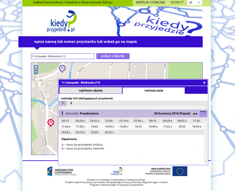 - odwiedzając stronę internetową swieradow.kiedyprzyjedzie.pl. W oknie wyszukiwania należy wpisać nazwę żądanego przystanku, jego numer lub też po powiększeniu obszaru mapy wskazać interesujący nas przystanek. Godziny odjazdów są dostępne po wciśnięciu przycisku "pokaż odjazdy". Ikonka widniejąca w kolumnie "odjazd" oznacza, że mamy do czynienia z prognozą, uwzględniającą opóźnienia związane z aktualną sytuacją drogową i związane z nią opóźnienia. Uaktualnianie prezentowanych prognoz przyjazdów autobusów dla wybranego przystanku odbywa się automatycznie co 15 sekund. W drugiej z zakładek można z kolei znaleźć teoretyczny rozkład jazdy w rozbiciu na tabliczki przystankowe na dowolnie wybrany dzień;