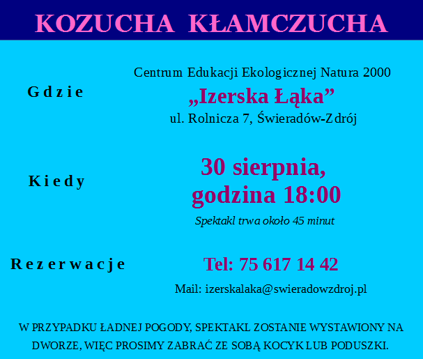 Zapraszamy jutro 30.08, o godzinie 18:00 do "Izerskiej Łąki" na spektakl dla dzieci pt: "Kozucha Kłamczucha".