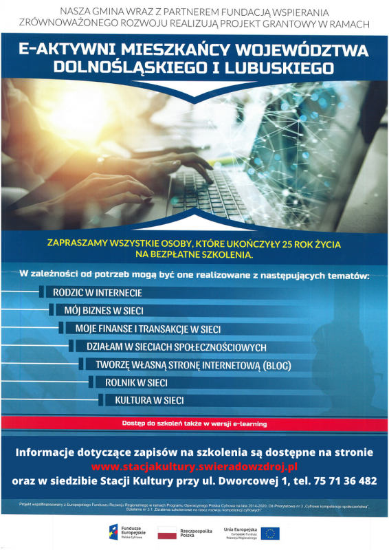 Nasza Gmina przy współpracy z Fundacją Wspierania Zrównoważonego Rozwoju, otrzymała dofinansowanie w kwocie 56 tys. zł w projekcie grantowym pn. „E-aktywni mieszkańcy województwa dolnośląskiego i lubuskiego”. Zadanie jest współfinansowane z Europejskiego Funduszu Rozwoju Regionalnego w ramach programu Operacyjnego Polska Cyfrowa 2014-2020, działanie 3.1. „Działania szkoleniowe na rzecz rozwoju kompetencji cyfrowych”. Operatorem środków jest Towarzystwo Rozwoju Gminy Płużnica.