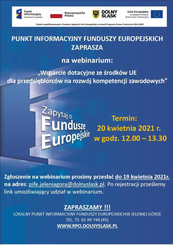 Punkt Informacyjny Funduszy Europejskich w Jeleniej Górze zaprasza  na webinarium pt. „Wsparcie dotacyjne ze środków UE dla  przedsiębiorców na rozwój kompetencji zawodowych  ” – 20.04.2021 r.