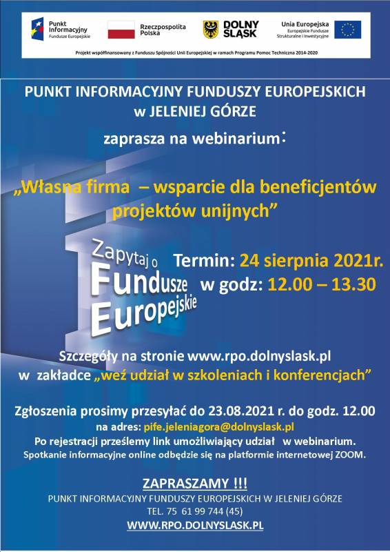 Punkt Informacyjny Funduszy Europejskich w Jeleniej Górze zaprasza na webinarium pt. „Własna firma wsparcie dla beneficjentów projektów unijnych”.