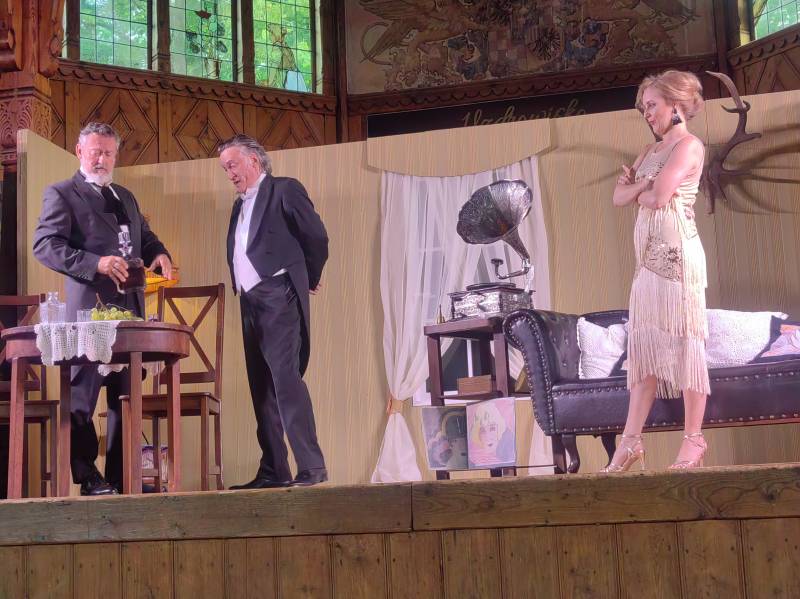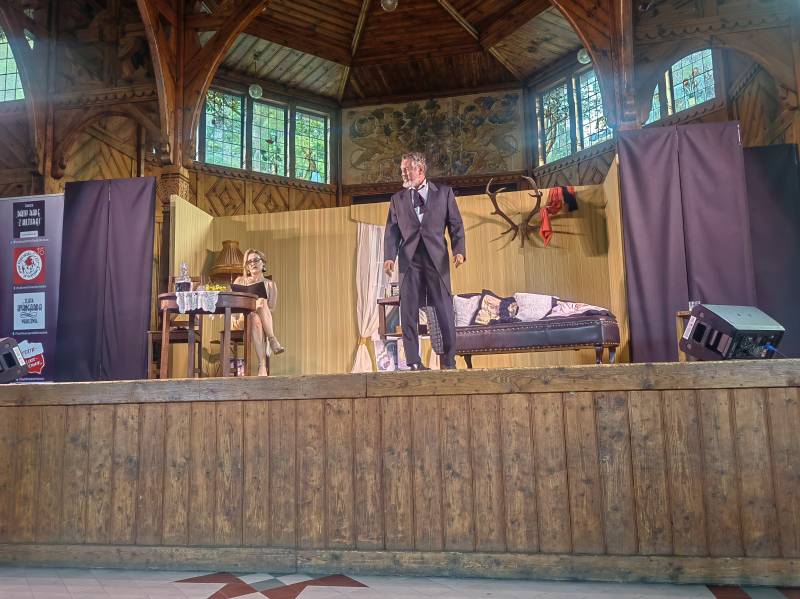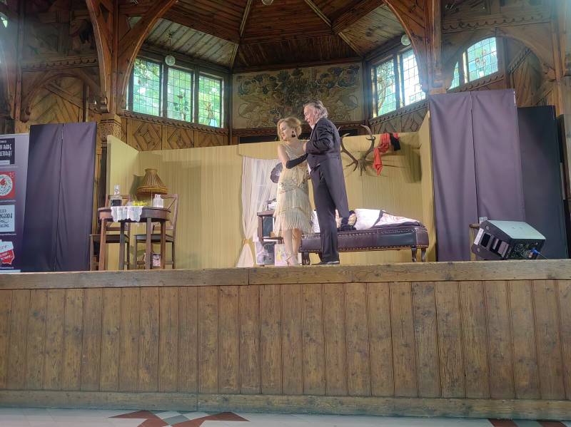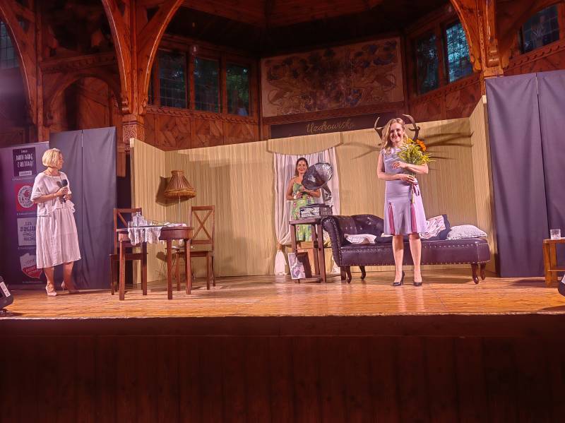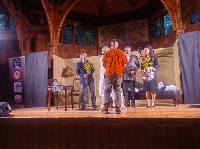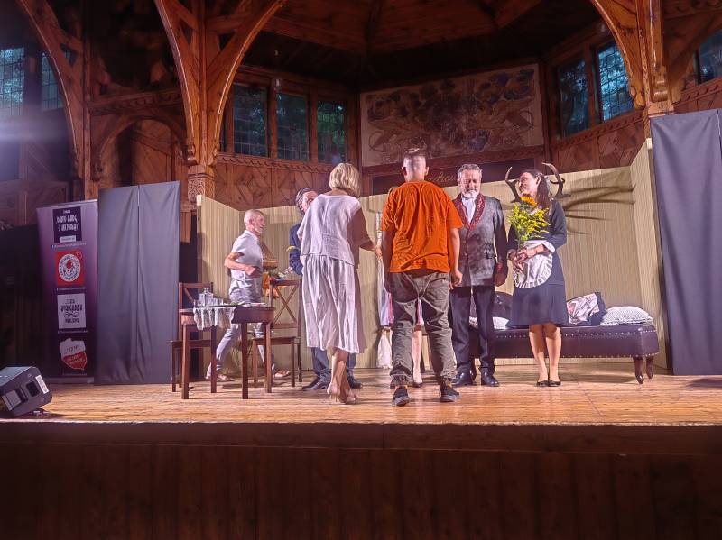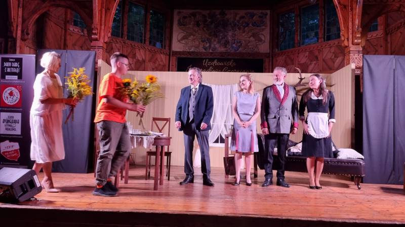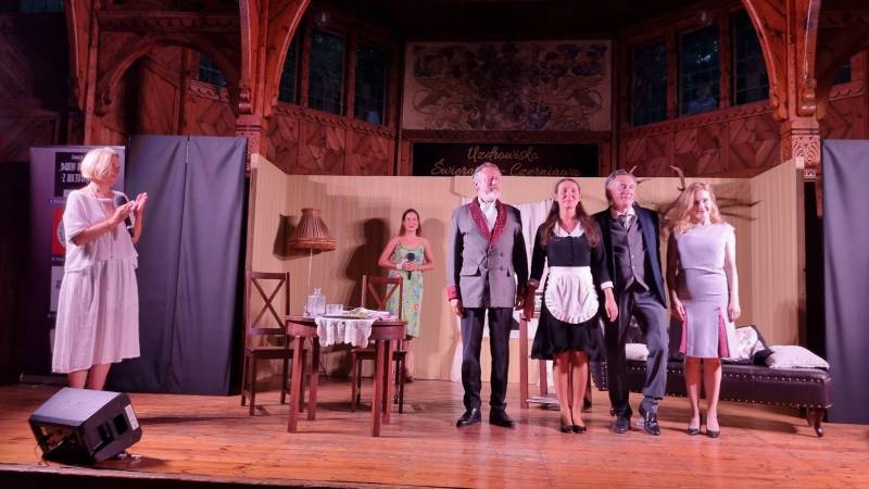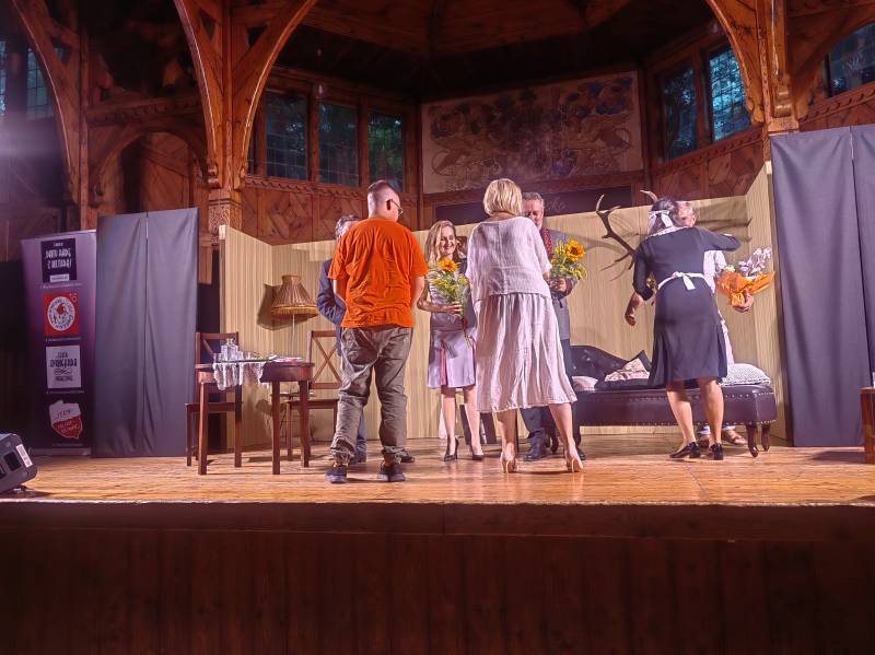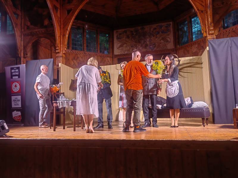 Znakomita obsada w składzie: Natalia Pietrasz, Aneta Gierat, Maciej Luśnia i Jan Korwin-Kochanowski, przeniosła nas do lat 20. ubiegłego stulecia i zawiłych romansów… Wszak napisany przez zaledwie dwudziestokilkuletniego Aleksandra Fredrę tekst sztuki w trzech aktach wierszem – o niewiernej Elwirze, o jej szukającym miłosnych uniesień mężu Wacławie, o kochanku Alfredzie oraz o całą te trójkę wodzącej za nos pokojówki Justysi – spotkał się z ogromnym zainteresowaniem zgromadzonej publiczności, a owacji na stojąco nie było końca. Głównymi atutami wystawionej sztuki „Mąż i Żona” byli znakomici aktorzy z Krakowa oraz przedni humor przenikający kunsztowne poetyckie frazy. Kto nie był z nami, niech żałuje…