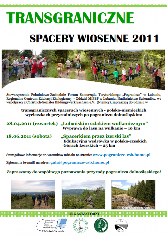 Stowarzyszenie Południowo-Zachodnie Forum Samorządu Terytorialnego „Pogranicze w Lubaniu, Regionalne Centrum Edukacji Ekologicznej - Oddział MiPBP w Lubaniu i Nadleśnictwo Świeradów, we współpracy z saksońskim partnerem – Christlich-Soziales Bildungswerk Sachsen e.V. z Miltitz, serdecznie zapraszają do udziału w VI edycji TRANSGRANICZNYCH SPACERÓW WIOSENNYCH - polsko-niemieckich wycieczkach przyrodniczych do najpiękniejszych zakątków pogranicza dolnośląskiego. W tym roku wędrujemy po Górach Izerskich oraz powiecie lubańskim.