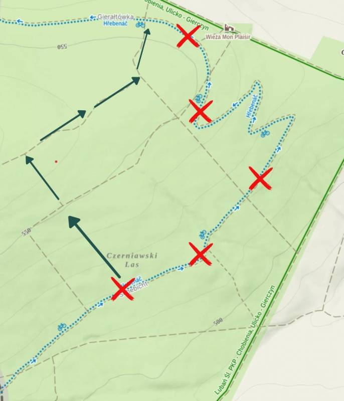 Z uwagi na prowadzone prace leśne w pobliżu ścieżki Single Track w okolicach nieczynnej wieży Mon Plaisir (niebieska pętla), fragment trasy będzie niedostępny.