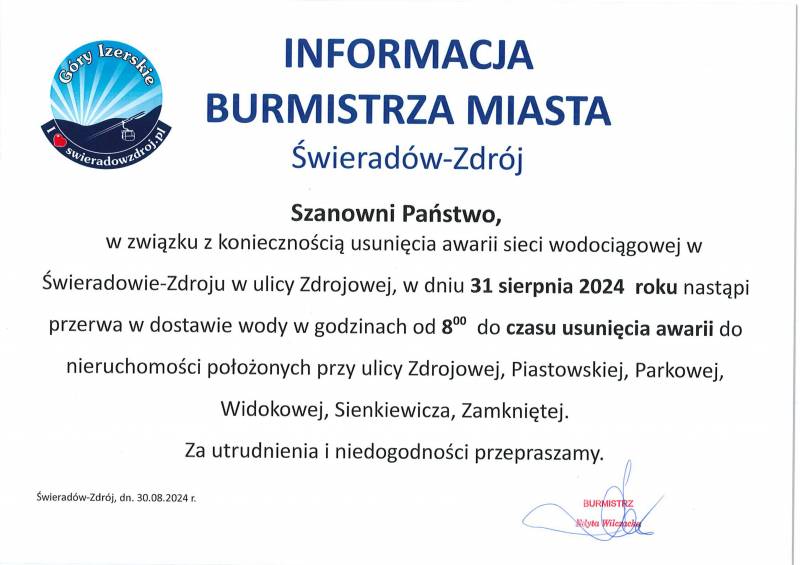 w związku z koniecznością usunięcia awarii sieci wodociągowej w Świeradowie-Zdroju w ulicy Zdrojowej, w dniu 31 sierpnia 202 4 roku nastąpi przerwa w dostawie wody w godzinach od 8 00 do czasu usunięcia awarii do nieruchomości położonych przy ulicy Zdrojowej, Piastowskiej, Parkowej, Widokowej, Sienkiewicza, Zamkniętej.