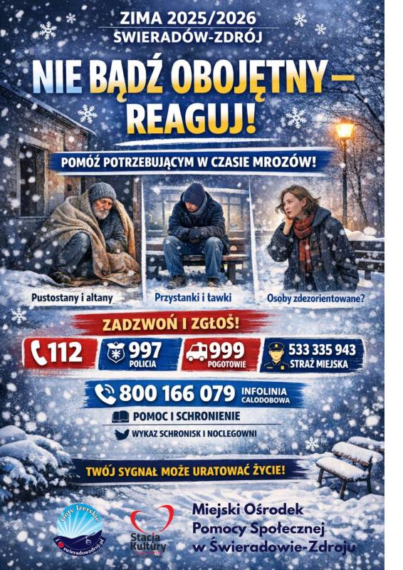 Miejski Ośrodek Pomocy Społecznej w Świeradowie-Zdroju apeluje do mieszkańców o zgłaszanie miejsc, w których mogą przebywać osoby potrzebujące pomocy w okresie niskich temperatur. Wspólnie możemy zapobiegać tragediom.