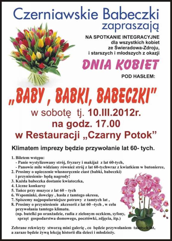 Zapraszamy wszystkie mieszkanki Świeradowa-Zdroju na spotkanie integracyjne z okazji Dnia Kobiet pod hasłem: „BABY , BABKI, BABECZKI”